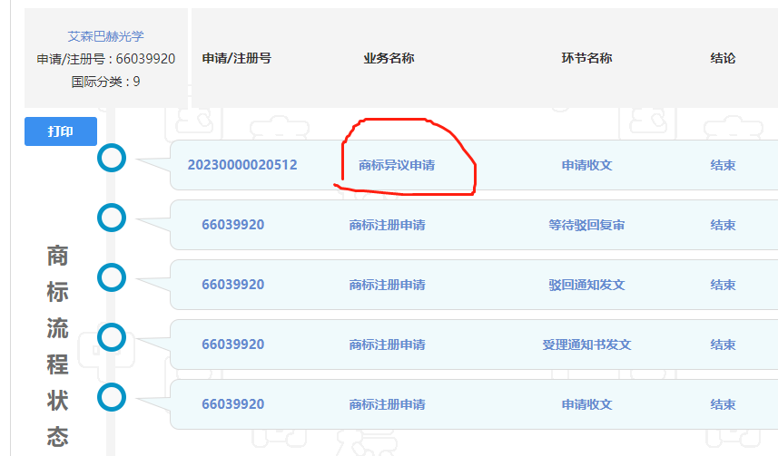 问:注册号的商标【艾森巴赫光学】已经公告结束很久了,请问是否有人申请异议,为啥我什么都没收到,异议没收到,注册证也没收到?麻烦贵司核实!