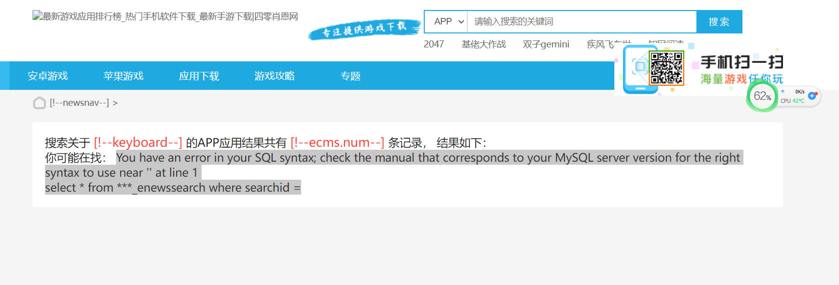 问:搜索列表APP页,出现问题:You have an error in your SQL syntax; check the that to your MySQL version for the right to use near '' at line * from ***_enewssearch where =