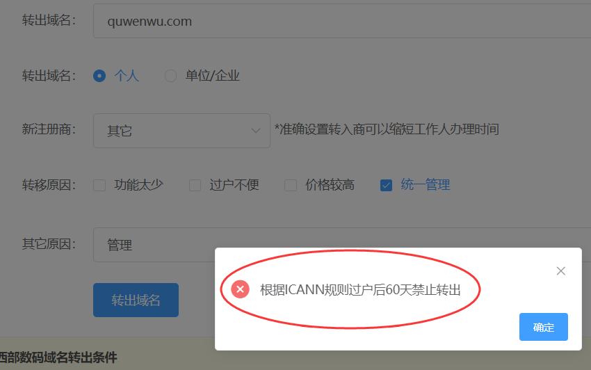 问:quwenwu.com这个域名要转出到别的平台,获取转移密码时提示:根据ICANN规则过户后60天禁止转出,我查了记录,最新一次是从阿里云转来的,时间是2023.1-9日,到今天正好也60天了,应该是可以转出的,为啥还不能转呢?请尽快处理下,谢谢!