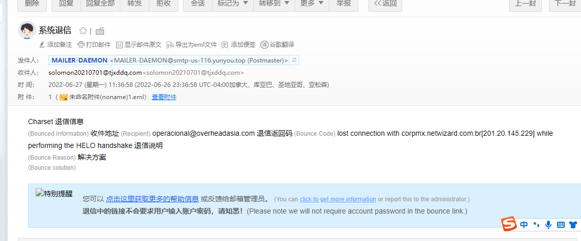 答:您好,我们邮件发送服务器测试可以正常连接到对方邮箱服务器,退信是对方规则限制,请联系对方根据收信日志核实下是哪方面的策略限制,非常感谢您长期对我司的支持!