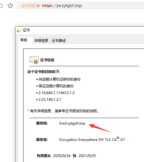 问:帮忙查看下 ye.zytgsh.top 这个域名SSL证书安装、 解析都是正确的吗 。感觉还是有问题。 我使用小程序绑定业务域名的时候绑定https://ye.zytgsh.top 添加不上,帮忙查看下 ye.zytgsh.top 这个域名SSL证书安装、 解析都是正确的吗