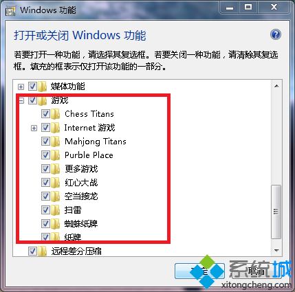 3、此时弹出\”windows功能\”对话框,稍等片刻。拖到最下面,找到游戏,你看,这个复选框是没有勾上的。在复选框中勾选我们需要的游戏;