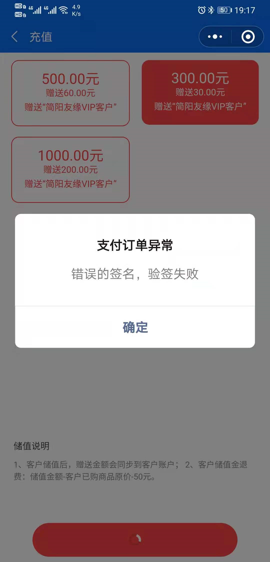 问:你好,我从后台设置了储值金以及赠送方案,可是测试时却出现了这个提示,无法操作储值,请问是哪儿出了问题呢?谢谢