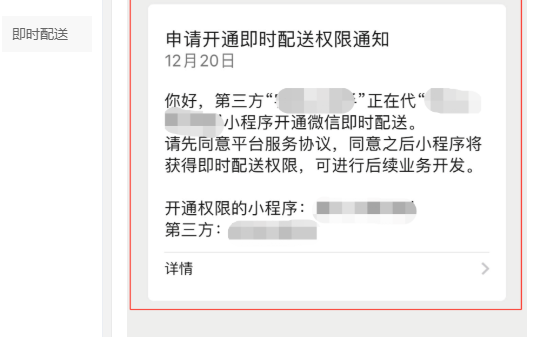 答:您好,即时配送 是接入的微信官方的接口,具体使用教程请您按照教程配置,若配置不完全正确,无法成功http://manage.vxsh.com//xiaochengxu/operationGuid=demo.jsp?type=timelyDelivery,非常感谢您长期对我司的支持.由此给您带来的不便之处,敬请原谅!谢谢!