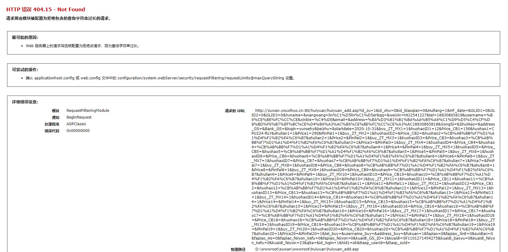 答:您好,当前测试为您重新配置了web.config文件,添加了对应请求参数长度,您可以重新核实看看,非常感谢您长期对我司的支持!