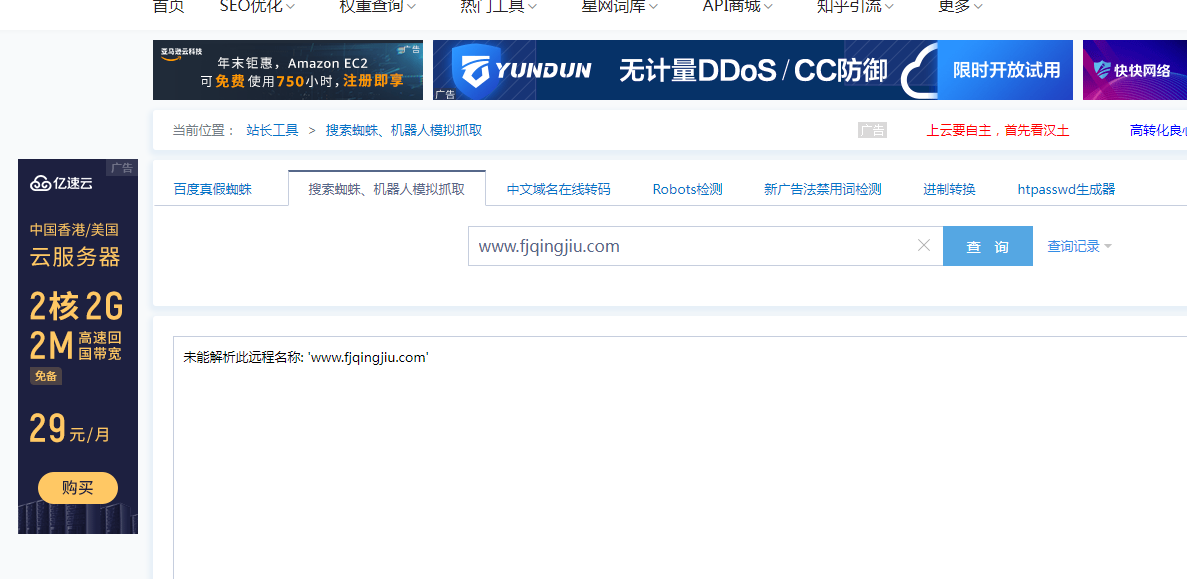 答:您好,这是第三方的模拟工具,是对方工具无法解析您域名,这个工具也是模拟抓取,也不是真正的百度蜘蛛抓取。百度抓取您可以到百度站长平台去添加网站,然后用百度的抓取工具进行抓取,如果有错误,请提供下报错信息,非常感谢您长期对我司的支持!