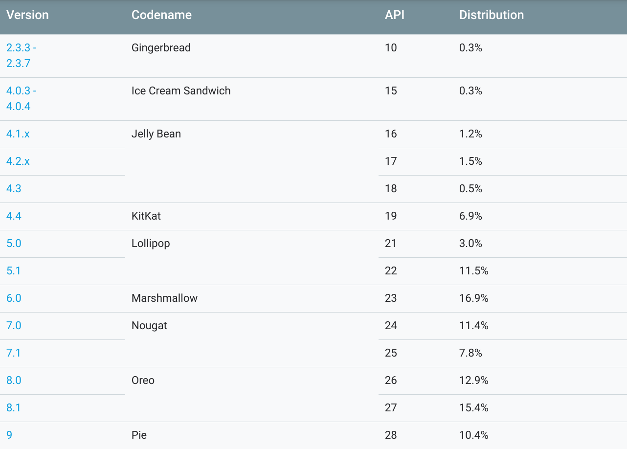 Google 发布了每月 Android 系统版本使用情况报告,展示了不同版本活跃用户的分布情况。