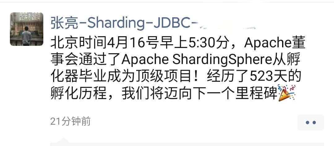 ShardingSphere 项目 VP 张亮发布了此条消息(ASF 官网公告还未发出):