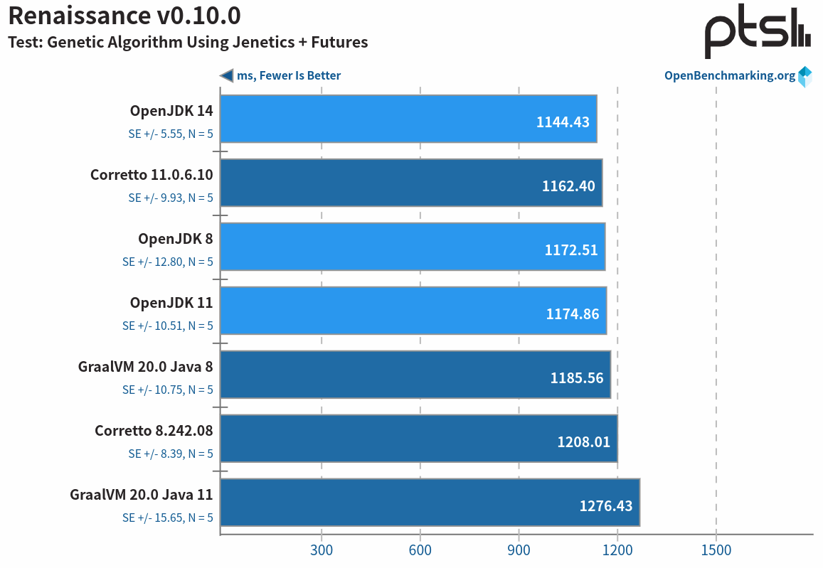 Phoronix 网站使用 Phoronix Test Suite 对比了在 OpenJDK 8/11、GraalVM 20 与 Amazon Corretto JVM 几个 JVM 平台中 Java 的基准性能。