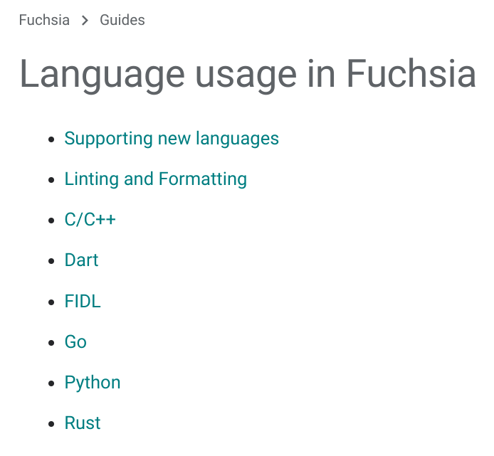 - 除了 Zircon 内核,Rust 被批准在整个 Fuchsia Platform Source Tree 中使用。