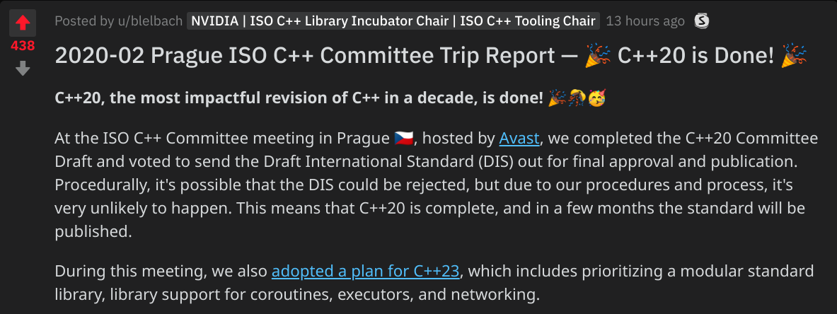 更加具体的内容可以查看原帖:https://www.reddit.com/r/cpp/comments/f47x4o/202002_prague_iso_c_committee_trip_report_c20_is