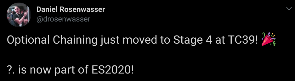 微软 TypeScript 程序经理 Daniel Rosenwasser 宣布 Optional Chaning(?. )进入 TC39 Stage 4 状态,这意味着该特性现在已经是 ES2020 标准的一部分。