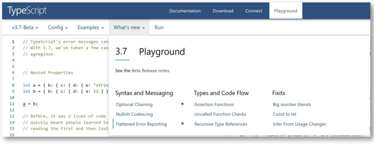 另外,作为更新的一部分,TypeScript 官网还有一个游乐场(Playground)可以体验所有新特性: