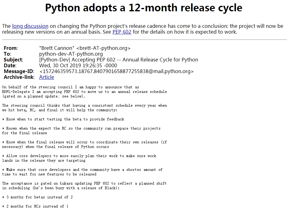 PEP 602 的作者是 Python 3.8 和 3.9 的发布经理 Łukasz Langa,因为 Python 3.8 已经发布,所以新的发布周期将从 Python 3.9 开始采用。