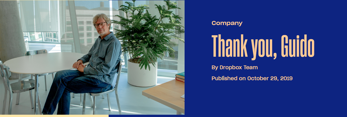 Dropbox 的官网公告也佐证了这一消息,并特意撰写长文以感谢 Guido 在 Dropbox 任职期间所做的贡献。