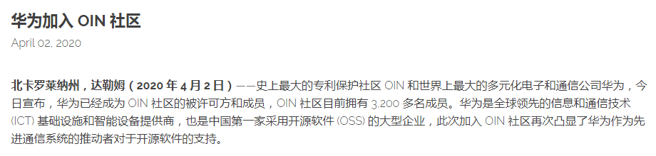 4月2日,华为宣布加入专利保护社区 OIN(Open Invention Network),成为 OIN 社区的被许可方和成员,同意与其它 OIN 成员以免专利使用费和互不侵犯(不进行专利主张或行使其专利权)的形式交叉授权其专利。