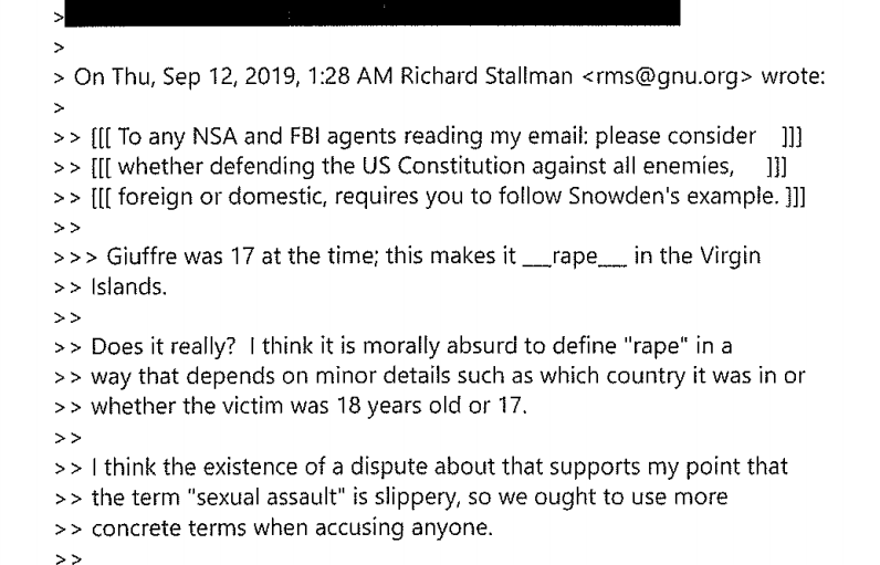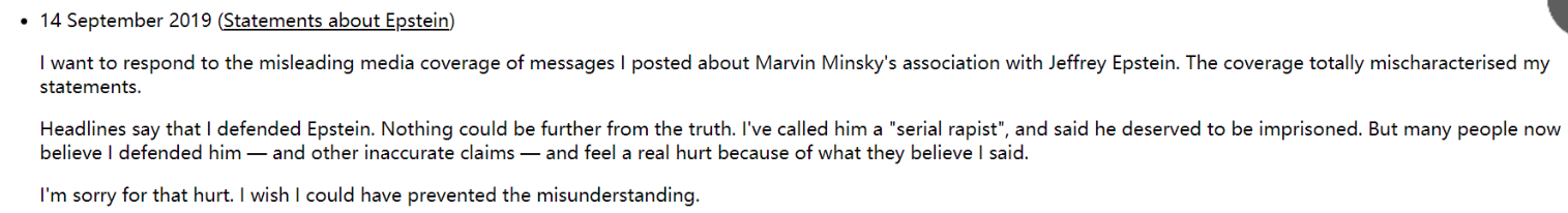 人们认为 RMS 是在为 Jeffrey Epstein 辩护,但是 RMS 在后来的邮件中表示并不是这样,他解释:“我想回应媒体对我发布的 Marvin Minsky 与 Jeffrey Epstein 相关消息的误导。报道完全错误地描述了我的说法,新闻都在说我为 Epstein 辩护……我称他为‘连环强奸犯’,并说他应该被监禁。但现在很多人都相信我为他辩护,以及其它不准确的说法……。”