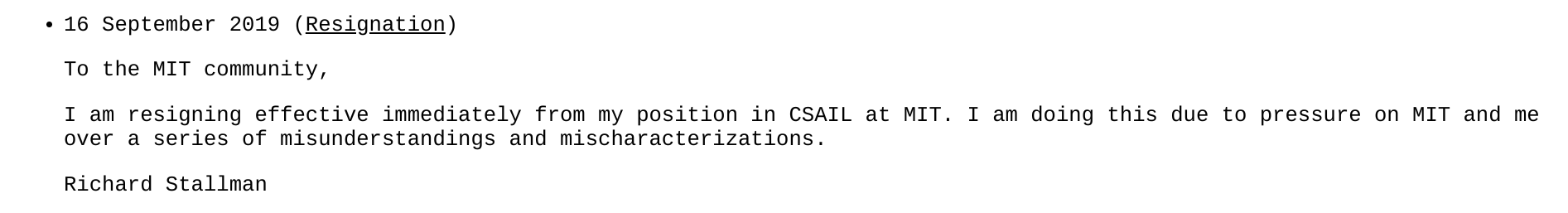 可能正是因为陷于这越来越深的误解中,RMS 现在决定辞去自由软件基金会与 MIT 的职务。