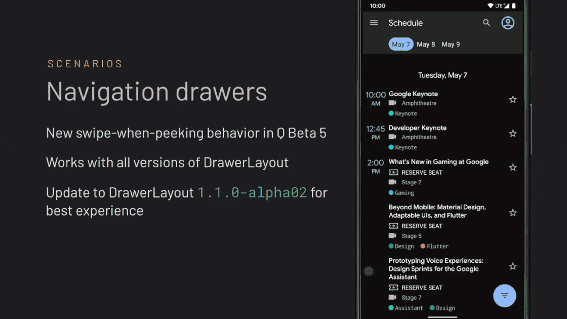 另外,团队还为包含导航抽屉(Navigation Drawer)的应用增加了一个名为 peek 的动作:用户轻压屏幕边缘然后再向内划动,便可拉出应用抽屉页面。所有版本的 DrawerLayout 均提供 peek 支持,其中以 DrawerLayout 1.1.0-alpha02 的体验最优。