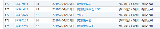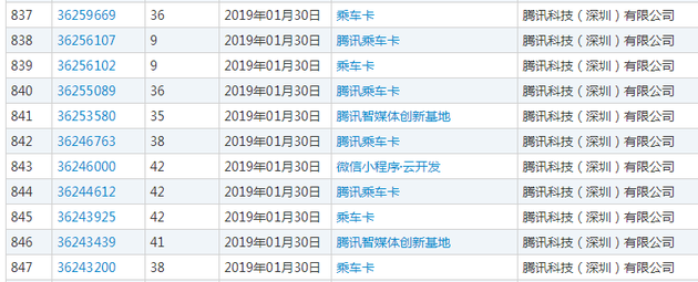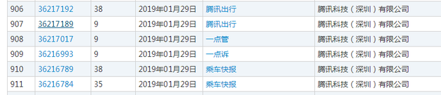 据中国商标网信息显示,自2019年1月29日以来,腾讯接连申请了“腾讯出行”、“腾讯乘车卡”、“乘车快报”、“腾讯乘车码”、“腾讯打车”等多个商标。