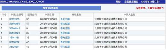 12月19日午间消息,新浪科技近日在中国商标网查询发现,今日头条母公司字节跳动在12月6日申请了吾先分期、轻栗分期、字节付三个商标,疑似进军金融业务,今日头条对此回应:不予置评。