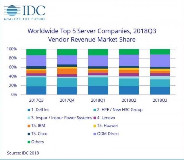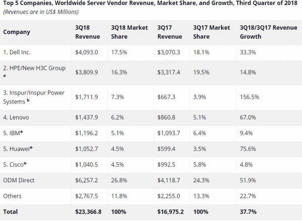 2018年第三季度,戴尔在全球服务器市场中排名第一,收入份额为17.5%,增长率为33.3%。 HPE/新华三集团位列第二,厂商收入份额为16.3%,增长14.8%。浪潮/浪潮Power System位列第三,市场份额为7.3%,同时这家新的合资企业市场份额同比增长了156.5%。联想位列第四,市场份额为6.2%,增长67.0%。IBM、华为和思科并列第五,厂商收入份额分别为5.1%、4.5%和4.5%。ODM Direct厂商总体收入同比增长51.9%达到近63亿美元。戴尔在出货量方面继续领跑全球服务器市场,占出货量的17.6%。