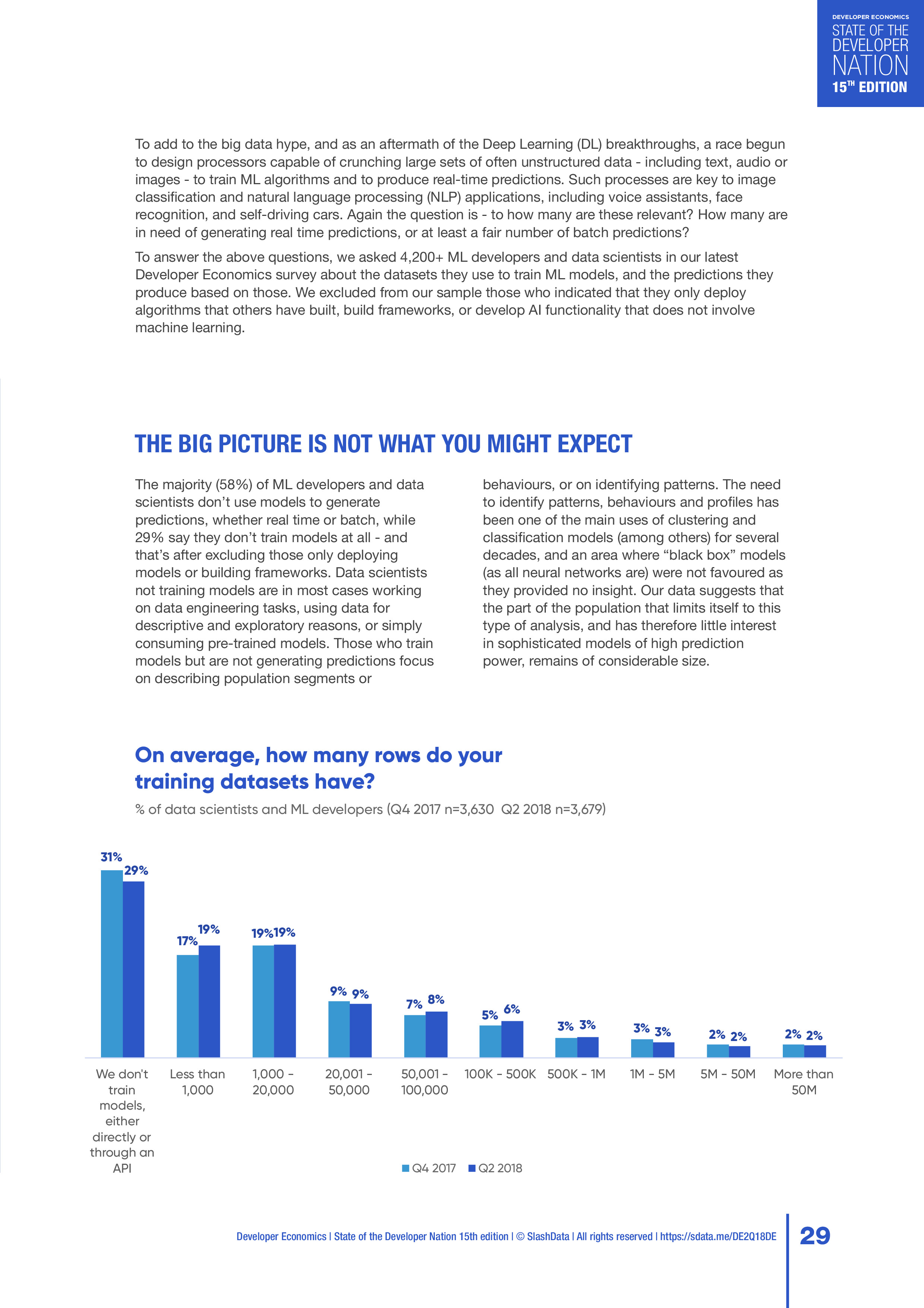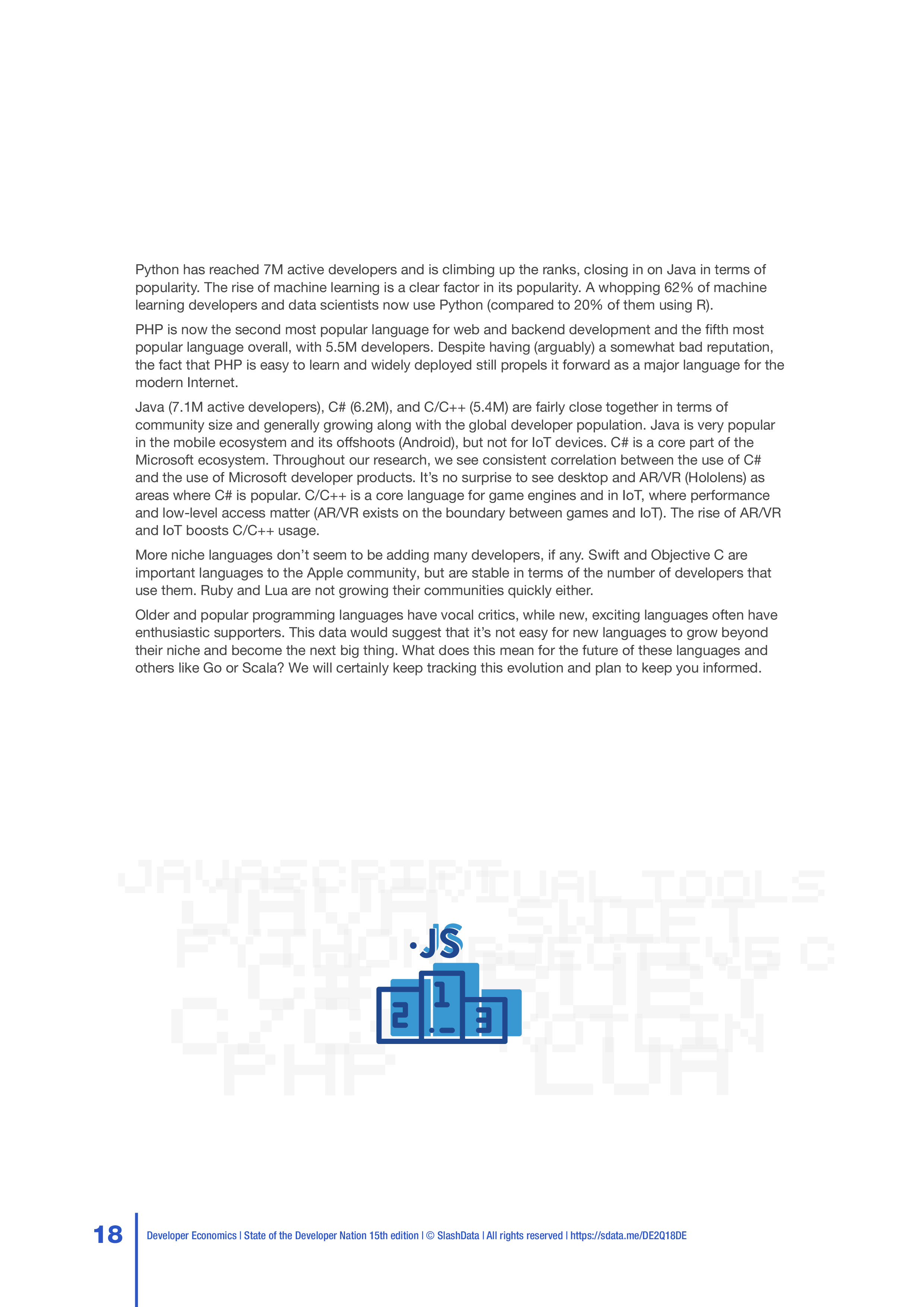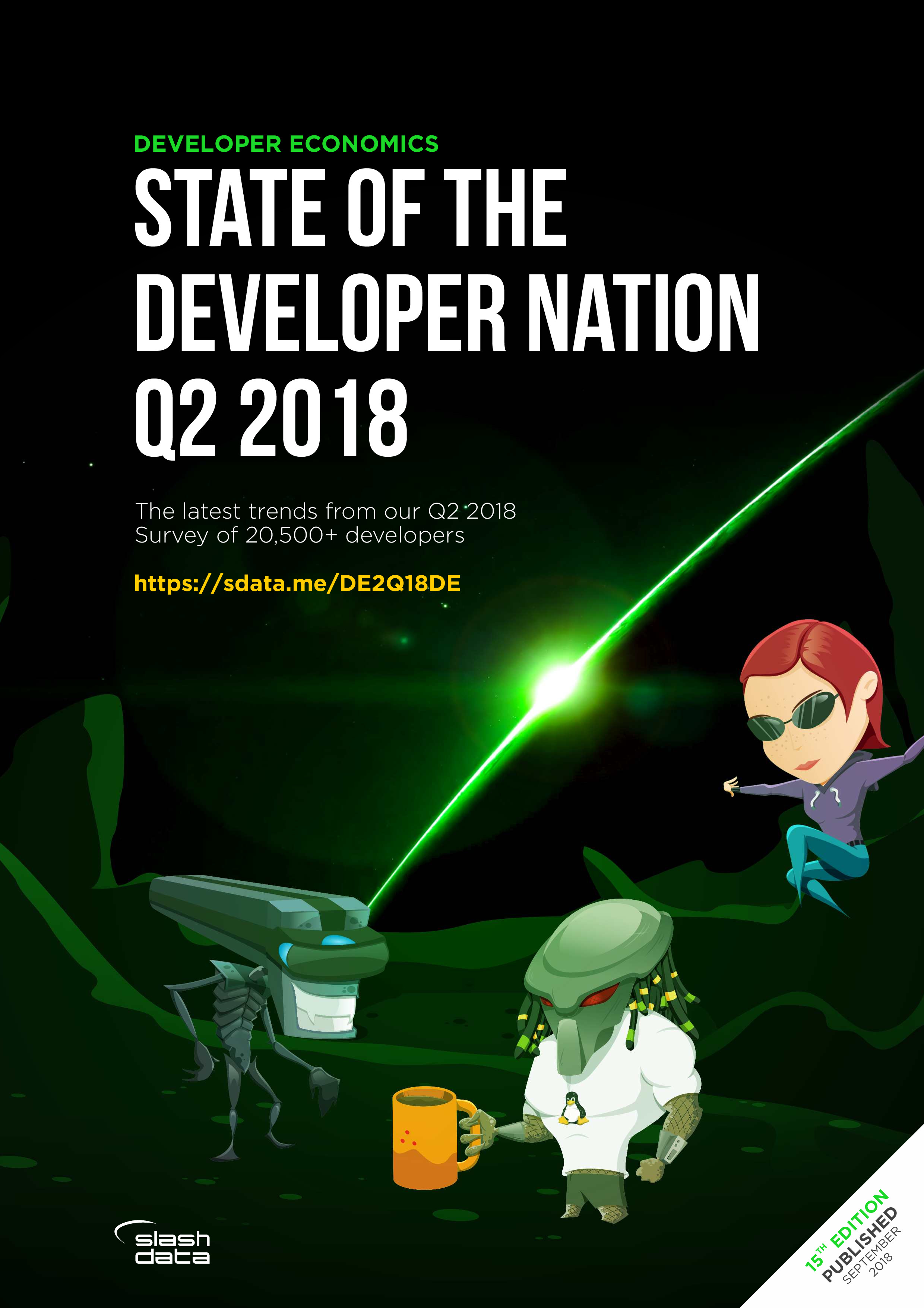 SlashData发布了“2018年第二季度开发者报告”,调查了167个国家的20,500多名开发人员,包括移动、PC、物联网、云计算、网络、游戏、增强显示和虚拟现实、机器学习等开发人员,以及数据科学家。