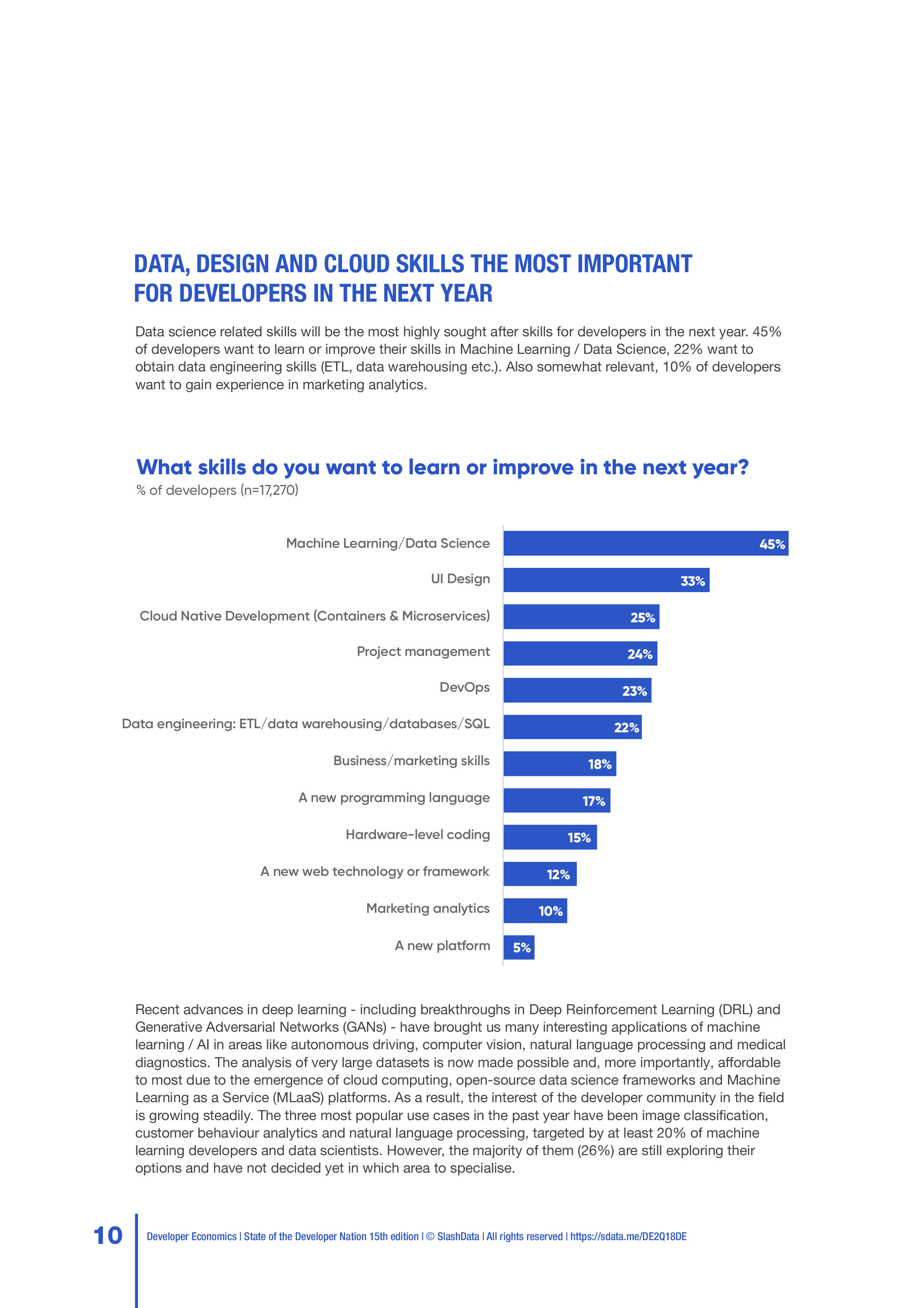 开发人员希望在明年学习或改进的顶级技能包括,45%的开发人员希望学习数据科学和机器学习方面的专业知识,33%希望在明年学习UI设计,25%希望提高他们的云技能。