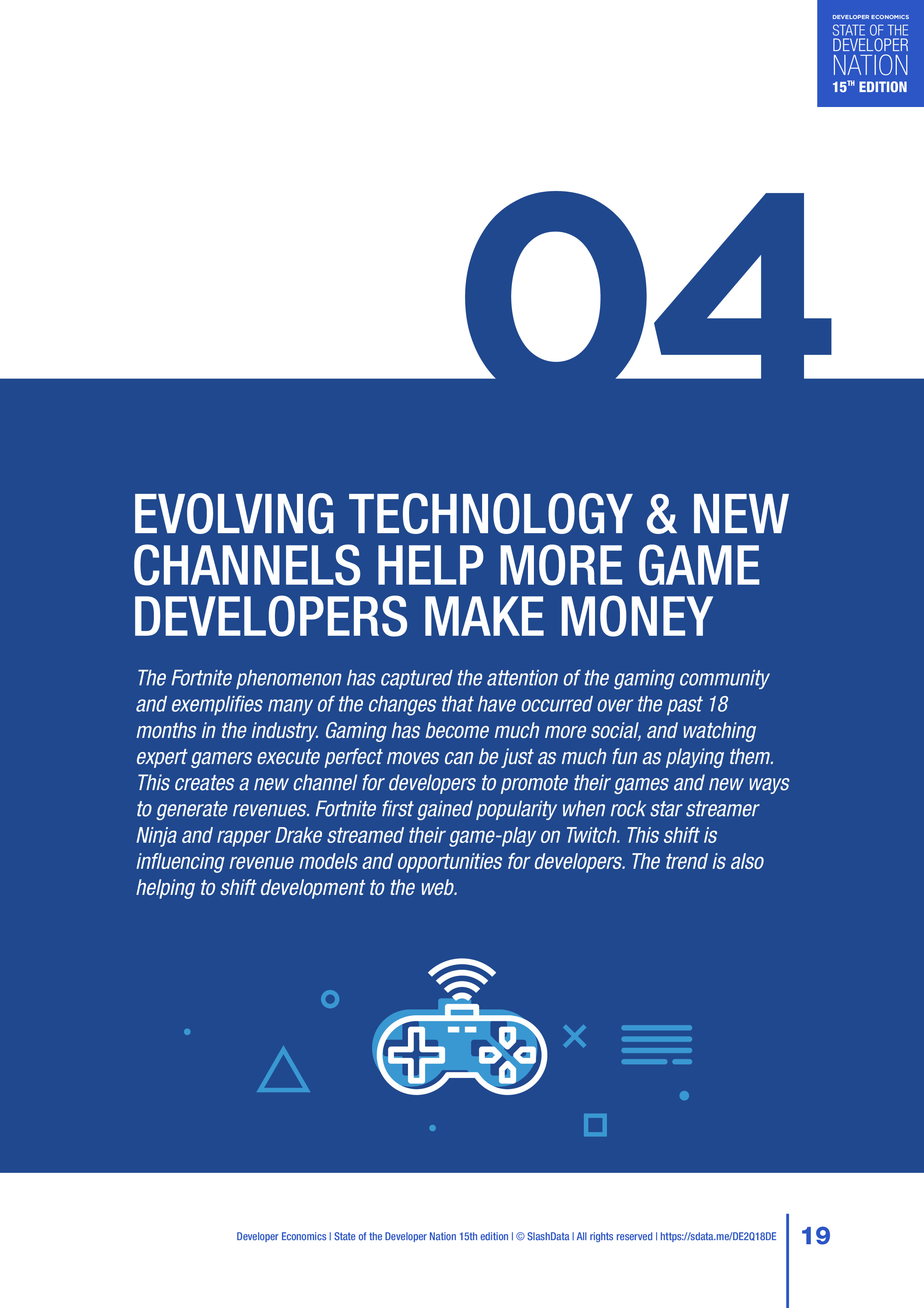 游戏开发商如何赚钱:48%的游戏开发者每月收入超过100美元,高于2017年的29%。目前有43%的游戏开发者瞄准网络,高于2017年的38%,而对平板电脑、智能手机和原生PC的关注度则在下降。