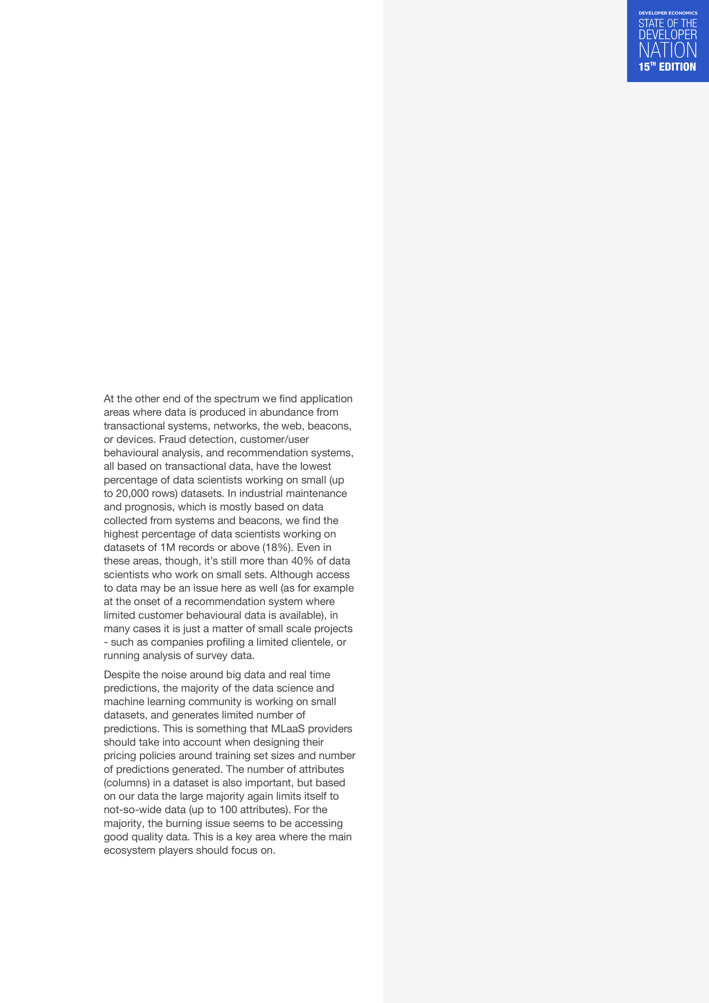 大数据和实时预测:它们有多少相关性?只有21%的数据科学家生成实时预测。其中大多数(68%)每月产生的实时预测不超过10,000条。在语音识别、图像分类和自然语言处理(NLP)领域,50%以上的数据科学家正在使用不超过20,000条记录的小型训练数据集。