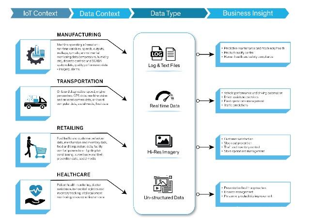 收集的数据类型也是确定存储策略的重要因素。在这里,物联网应用和行业发挥了重要作用。表1列出了四个垂直行业中的一些数据收集方案以及可由数据驱动的洞察力。