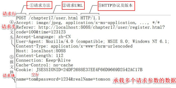 以上代码中 POST 代表请求方法, /chapter17/user.html 表示URI, HTTP/1.1 代表协议和协议的版本。现在比较流行的是Http1.1版本。大家也可以了解下 2.0 :《让面试官颤抖的 HTTP 2.0 协议面试题》。
