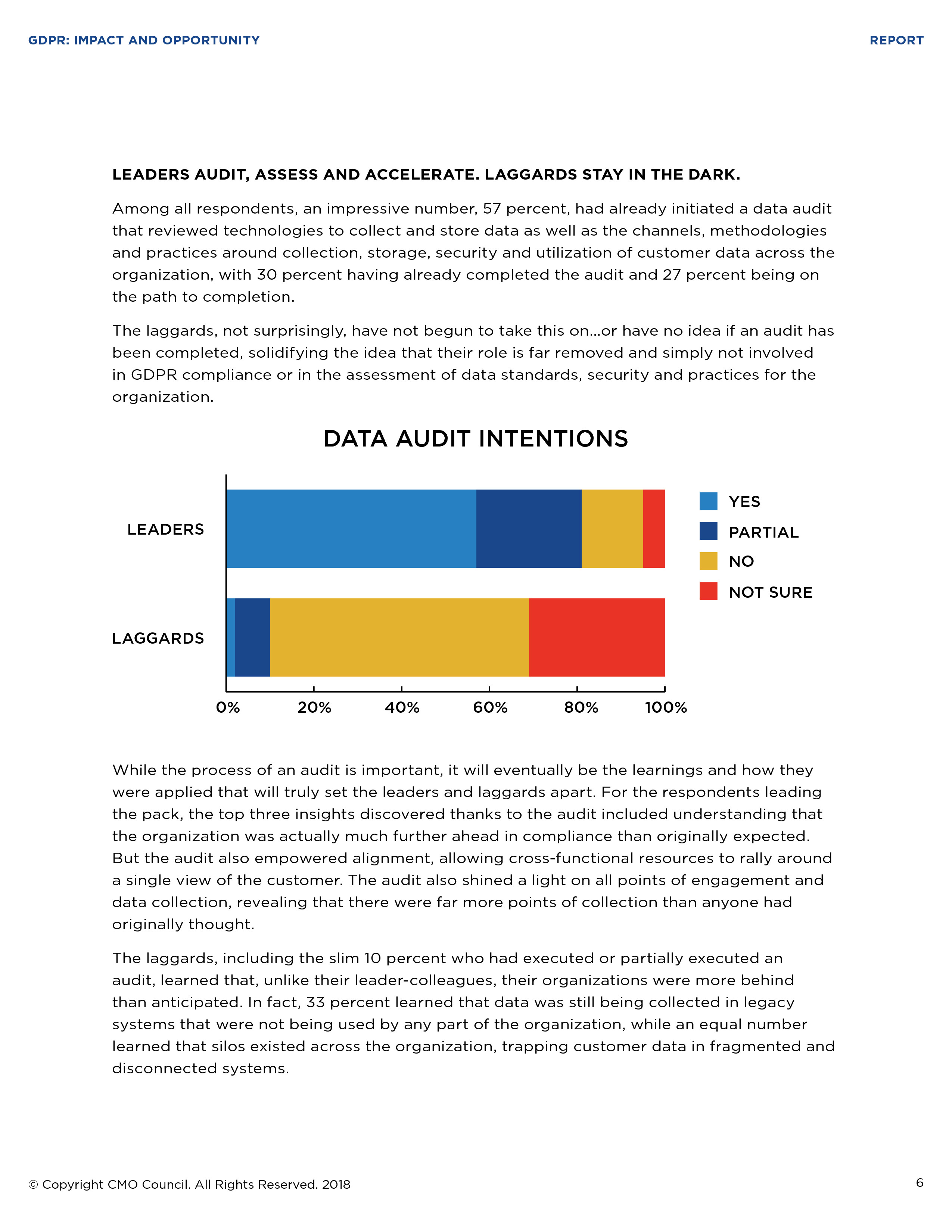 所有的受访者都同意,GDPR合规是一种责任,企业必须更好地保护客户的数据。但是,领袖也将GDPR视为一个机会,建立信任、提供更好的服务,并执行负责的数据实践。滞后者更愿意将GDPR视作欧盟企业的一个问题,给管理合规带来了负担。