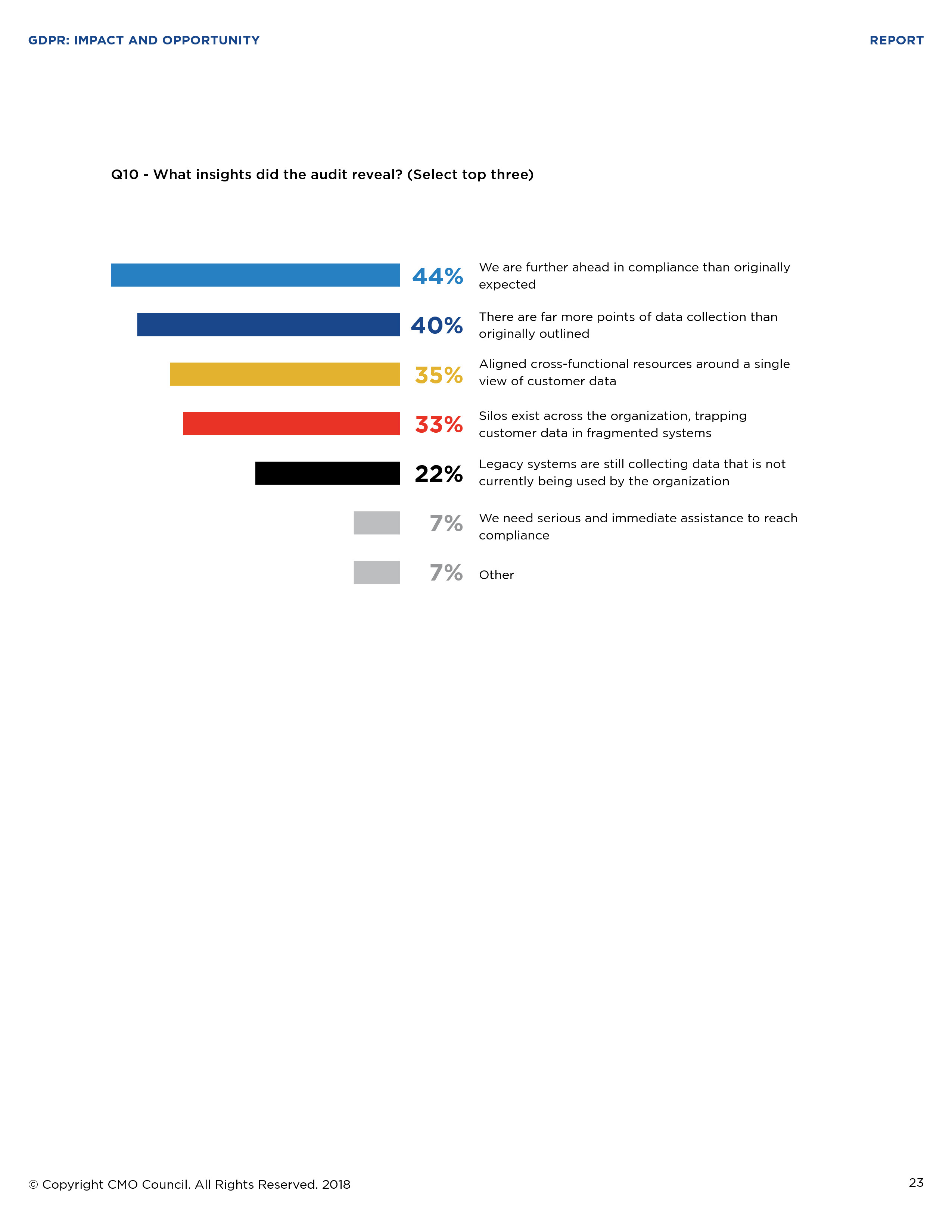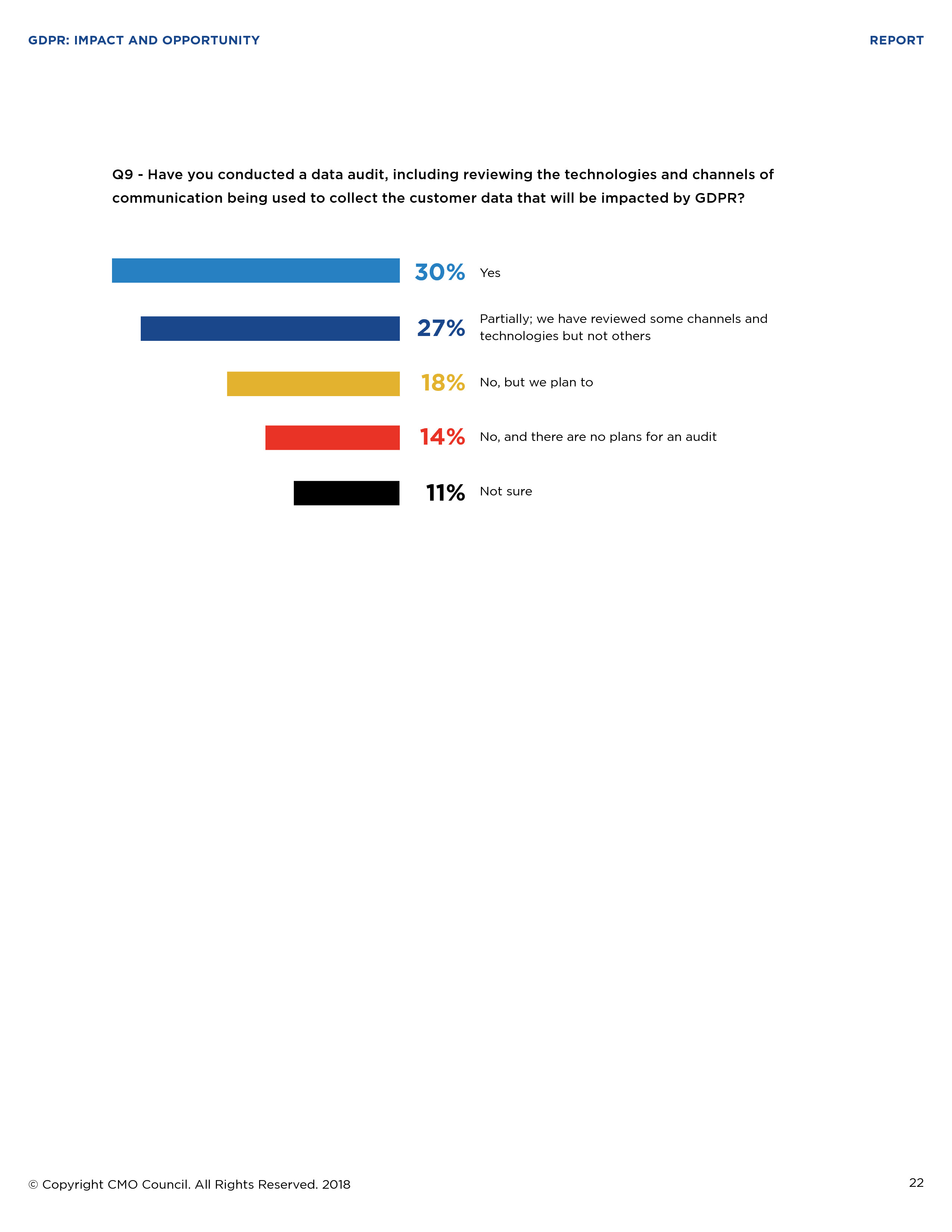 在所有受访企业中,57%已经有数据审计,收集和存储数据,以及整个企业收集、存储、保护和利用客户数据的渠道、方法和实践。30%的企业已经完成审计,27%的企业正在部署审计。而滞后者还没有任何相关的想法。