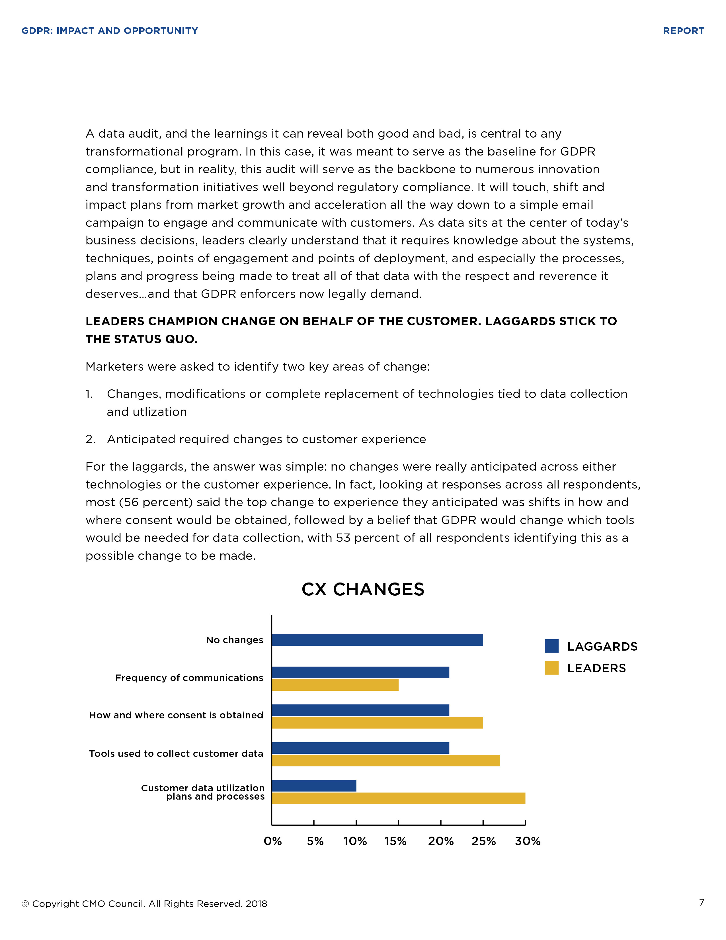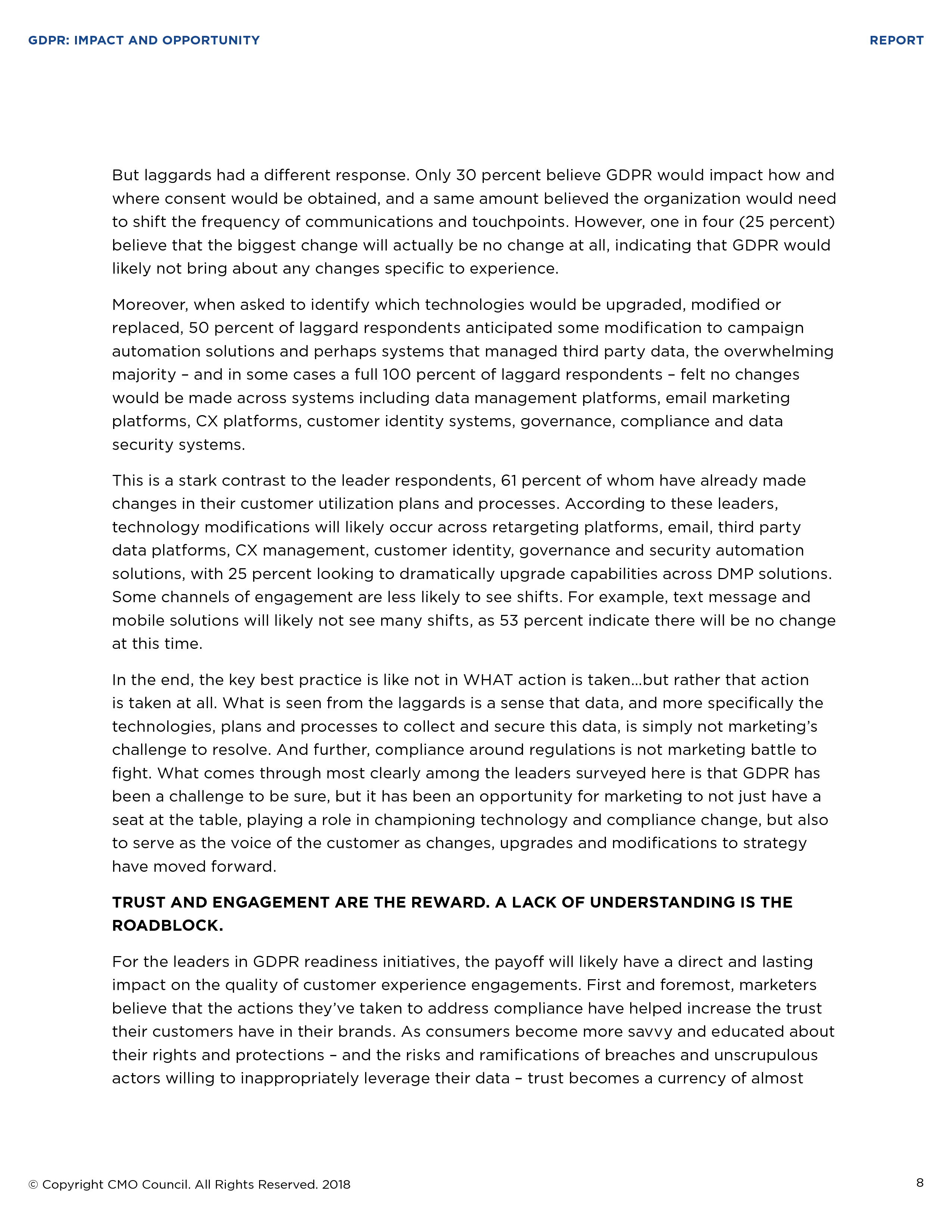 GDPR合规方面的领袖企业来说,回报可能会对客户体验活动的质量产生直接和持久的影响。营销人员认为,解决合规问题所采取的行动有助于提高客户对其品牌的信任度。随着消费者对自己的权利和保护变得更精明,信任将成为无法估量的资产。这种信任将变成参与度的动力。