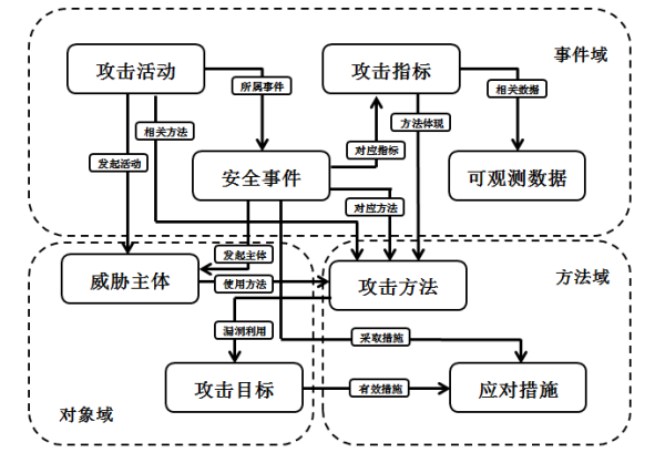 攻击活动、安全事件、攻击指标和可观测数据则构成了完整的攻击事件流程,归为事件域;即有特定的经济或政治目的、对信息系统进行渗透入侵,实现攻击活动、造成安全事件;而防御方则使用网络中可以观测或测量到的数据或事件作为攻击指标,识别出特定攻击方法;