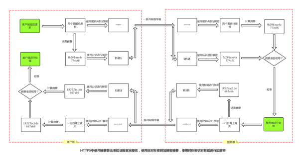 但是这里的前提是,服务器发过来的摘要没有被篡改,如果有人在篡改了数据之后,连摘要也改了,那就有点坑了。所以HTTTPS会使用非对称加密对摘要进行加密,防止摘要被篡改。