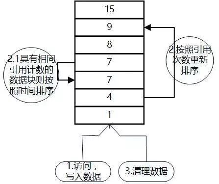 LFU中的每个数据块都有一个引用计数,数据块按照引用计数排序,若是恰好具有相同引用计数的数据块则按照时间排序;