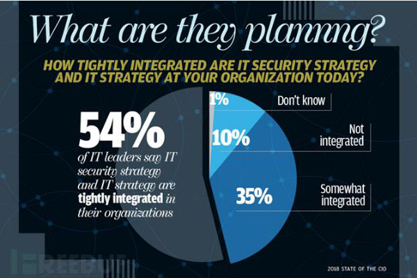 接受调查访问的公司IT高管深知这方面还存在很多不足之处,所以在我们问到,三年后如何整合IT安全战略与IT战略时,有82%的公司IT高管表示,会把这两者“紧密集成”,而仅有2%的公司IT高管表示不会集成整合。