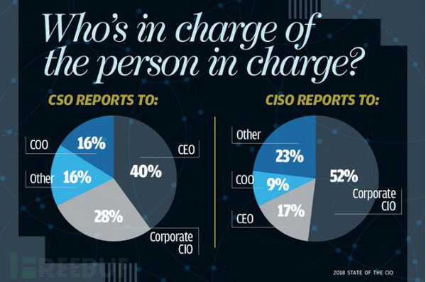 在设置有CSO的公司里,大约有一半公司的CSO直接向CEO或COO汇报工作,而有将近四分之一公司的CSO直接对公司CIO高管负责;而对设置有CISO的公司里,这种工作负责制几乎是相反的,有接近一半公司的CISO受CIO高管负责领导,有四分之一公司的CISO受公司其它高管负责领导。根据这种调查情况来看,至少从目前来看,似乎CSO是个更具威望的职位。而且在这两个职位之上,有时还会存在一些其它的隐形潜在领导,比如部门CIO和资产防损的CFO等。