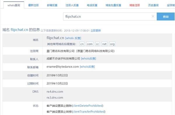 12月10日消息,上周Bianews报道,今日头条即将上线一款名为“飞聊”的重量级社交产品。现在关于“飞聊”的消息又进一步,即今日头条已经买下了“飞聊”的英文域名“flipchat.cn”。