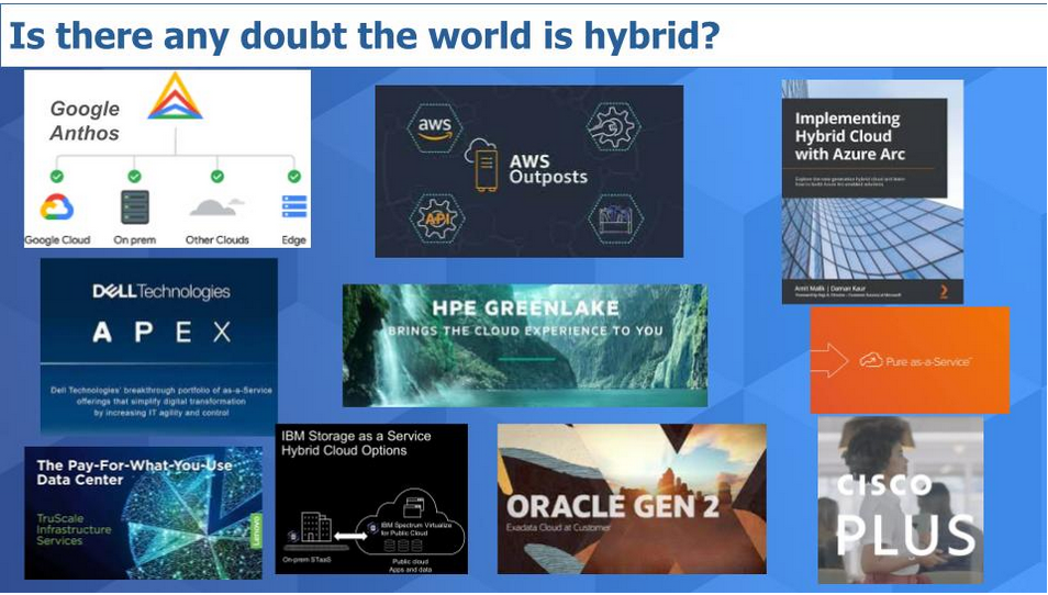 美国的超大规模企业都有一个或多个不同形式的产品,例如AWS Outposts、Google Anthos和Azure Arc。但如今真正的行动来自内部部署供应商。每家大公司都推出了即服务产品。其中大部分最初源于服务主导、财务主导的计划,但正在演变为真正的即服务模式。