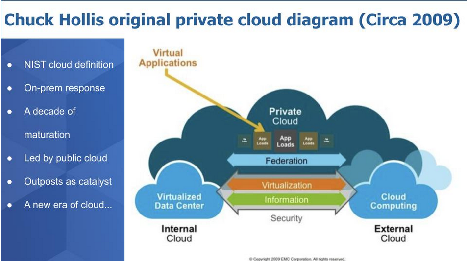 首先让我们回溯到2009年,EMC公司首席技术官和营销大师Chuck Hollis当时发表的一篇博客文章中提到了“私有云”这一术语。