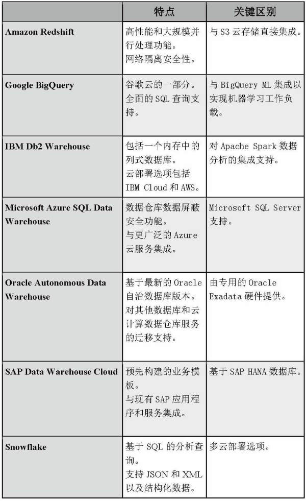 现有的云部署。每个主要的公共云提供商都拥有自己的数据仓库,该仓库提供与现有资源的集成,这可以使云计算数据仓库用户更轻松地进行部署和使用。