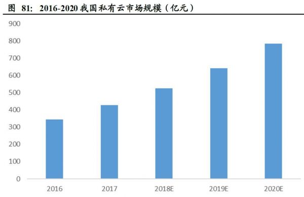 我国IT需求主要来自政府以及电信、银行等国有资本主导的企业,此类部门对价格的敏感度相对较低,但是对信息安全、服务定制化等的要求极高,因此目前我国已经部署云计算的企业中采用私有云的比例远高于公有云或混合云,考虑到未来一段时间内我国云计算的付费主体仍将是政府/国企等部门,预计国内私有云的建设仍将以较快速度发展。2017年我国私有云市场规模427亿元,未来还将稳健增长,到2020年规模达到784亿元,2017-2020年CAGR为22.75%。