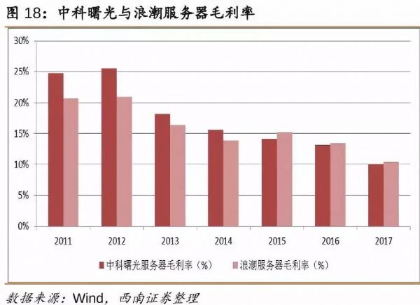 2018Q1,云服务器销售额达到20.8亿美元,同比增长126.5%,在整体市场的增长贡献为51.7%。下游互联网厂商业务的快速增长与标准化,特别是云计算服务商的崛起导致原有的分散客户的格局进一步集中,服务器厂商议价能力,毛利率持续下滑。