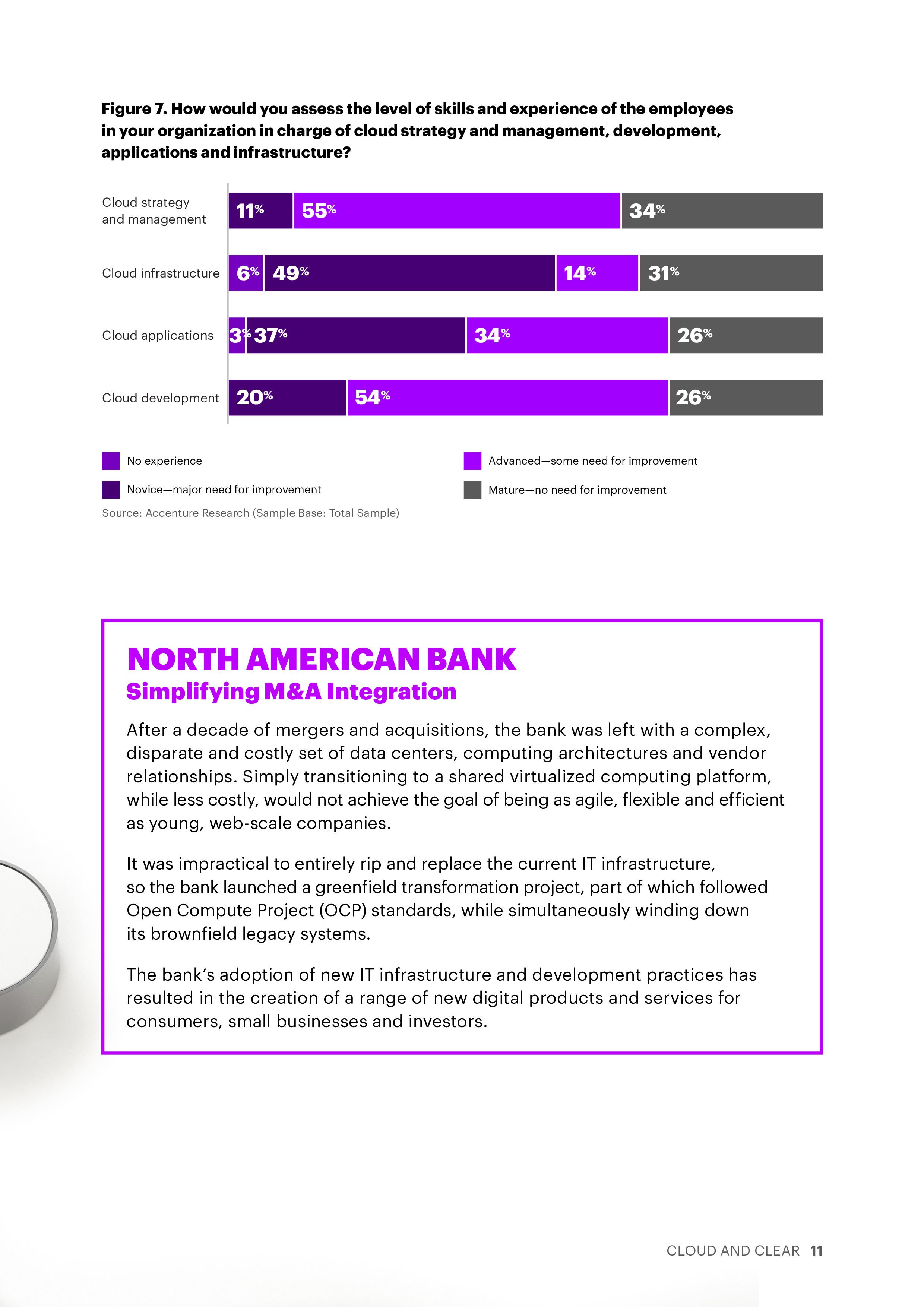 超过2/5的受访银行高管(43%)认为他们的银行缺乏云采用策略,或者只是开始实施基本的云实践,只有26%的受访者有坚实的云采用策略,其中包括持续改进效率的测量。