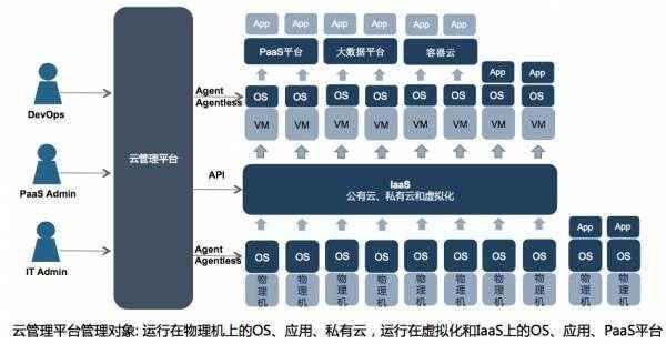 云管理平台是独立于IaaS及PaaS之外的管理平台,基于云API管理应用运行所需的资源和环境,通过代理或非代理方式管理应用运行的OS环境及应用,对基础设施层支持各种公有云私有云以及传统IT物理机虚拟机,并支持各种运行在IaaS或物理机之上的各种架构的应用。