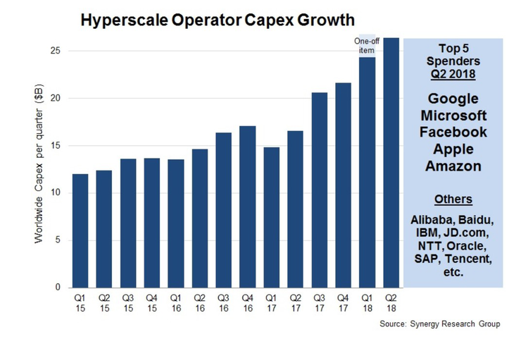 Synergy Research的统计数据显示,第二季度全球超大规模科技公司的资本支出比去年同期增长59%。2018年整个上半年,资本支出总额达到530亿美元,去年同期则为310亿美元,增幅为71%。