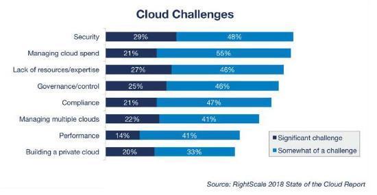 图像来源:RightScale 2018云状态报告然而,许多调查发现组织仍然对云计算有所担心。虽然IT领导者因为其带来的好处而拥抱云,但他们仍然面临着非常重要的云计算挑战,包括以下方面: